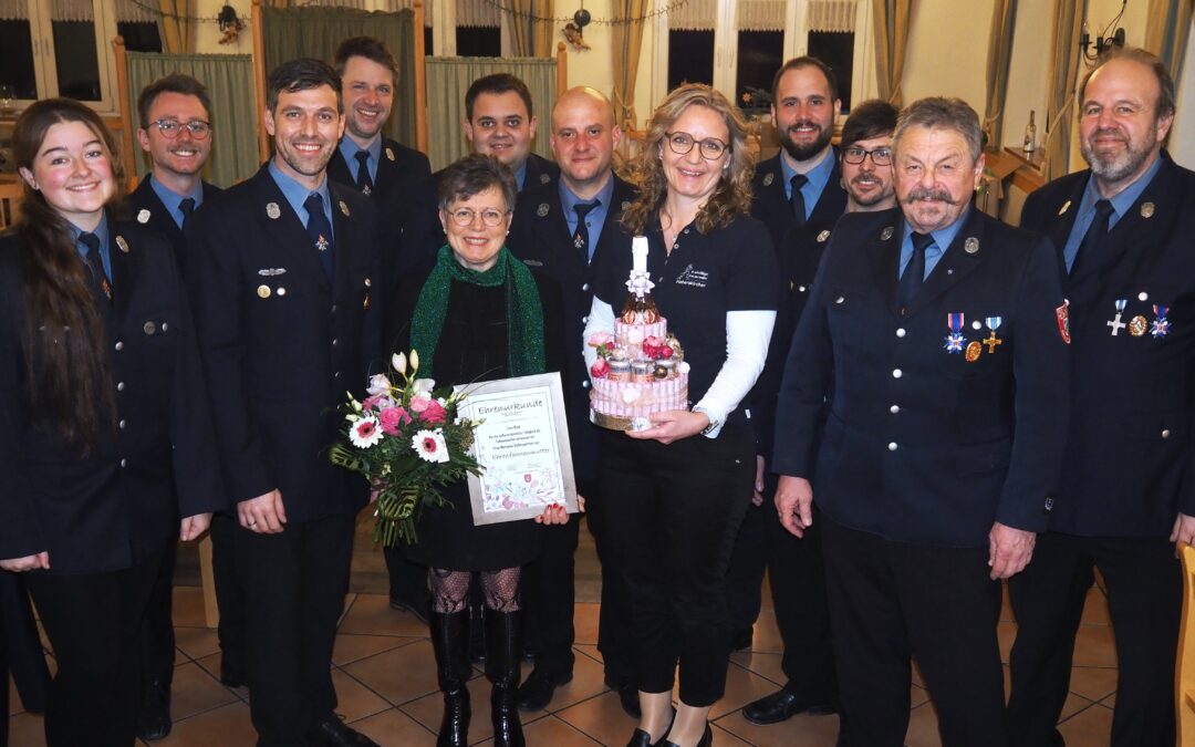 Der zweite Höhepunkt der Versammlung war die Ernennung von Marianne Siebengartner zur Ehrenfahnenmutter. Als Fahnenmutter von 1996 und langjährige Unterstützerin des Vereins wurde ihr unermüdlicher Einsatz für die Feuerwehr unter großem Applaus gewürdigt.
